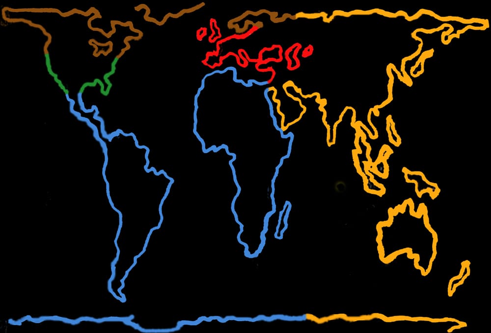 A map, whether of the world, or the Tube network, is a simplified schematic diagram. The map used by the artist is based on the Peters projection (1974), which portrays each country according to its true surface area. Traditional world maps have often been extremely distorted, showing Europe, North America and parts of Asia as much larger than they really are, reflecting the agendas of the commissioners of the maps, the times in which they were produced and the state of the world at the time of their creation. The colouring of maps has also been based on politics – using different colours to identify countries under the same administration.