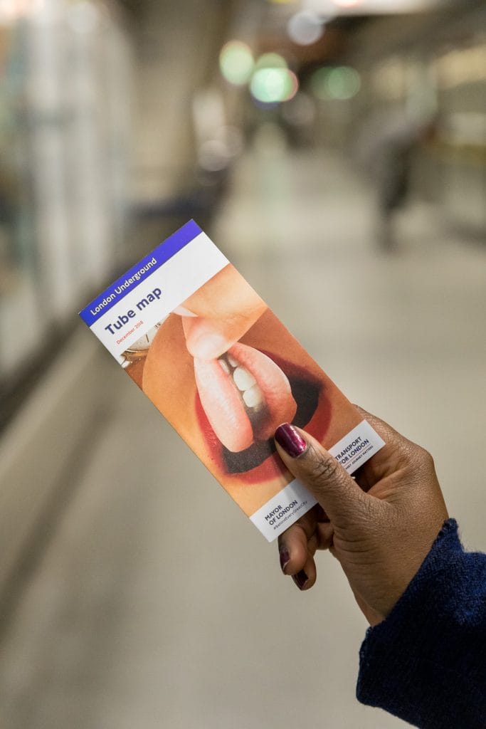 The work, the first large-scale public commission by Linder in London, consists of an 85 metre long street-level billboard at Southwark station and a cover commission for the 29th edition of the pocket Tube map.