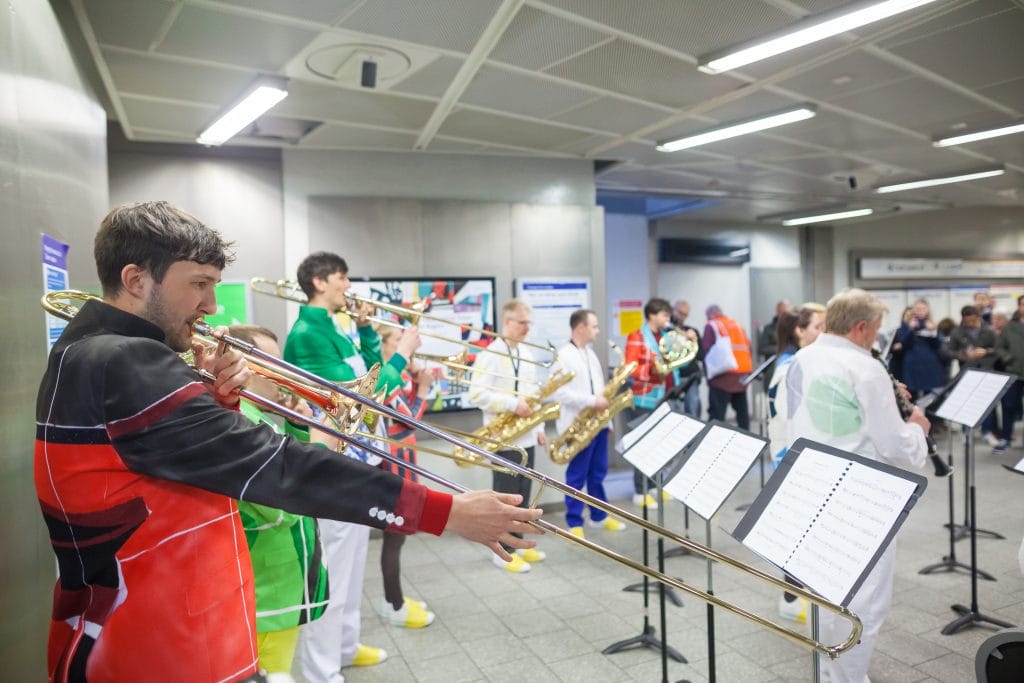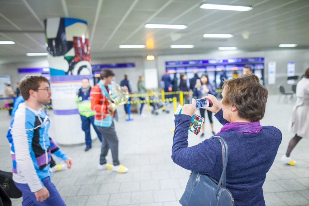 Sunday 3 April 2016 was the first date in a series of sumptuous, one-off performances with players from London Sinfonietta on the Victoria line. From solo players to ensemble pieces, the events were visually inspired by the Victoria line’s unique tile motifs, with costumes designed by Jenny Hayton and graphic works by Fraser Muggeridge studio.
