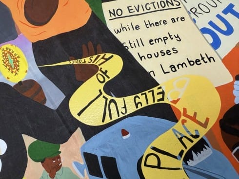 Belly Full of Histories pays tribute to figures and communities that have shaped the culture of the local area. Activist and campaigner Marcia Rigg is depicted in ‘Holding the Flame’, a virtual statue created by Aswarm in memory of her brother, Sean Rigg, who died in police custody at Brixton Police Station in 2008. SisterMatic, a sound system which started in the 1980s in Brixton, can be seen providing a safe space for Black Lesbian women.